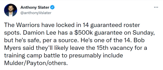 来源:JRS直播网08-14 11:31JRS直播网讯 北京时间8月14日,拉斯维加斯夏季联赛中,勇士94-84击败雷霆,穆迪22分,库明加18分7篮板。跟队记者Anthony Slater报道,勇士已经锁定了14个阵容名额,消息源透露,库里的妹夫达米恩-李留队没有悬念,他在14人之中,虽然他的新赛季合同是部分保障。总经理迈尔斯透露,常规阵容的最后一席,将留给训练营竞争胜出的球员,预计是穆尔德、小佩顿或者其他球员。