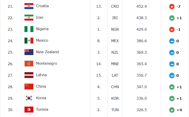 21-30位:克罗地亚、伊朗、尼日利亚、墨西哥、新西兰、黑山、拉脱维亚、中国、韩国、突尼斯。