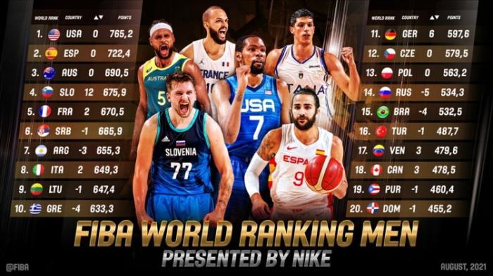 在前40名的国家中,排名上升最多的就是斯洛文尼亚,他们提升了12个位次。东契奇在奥运会上的出色表现,率领这支球队获得奥运会第四的战绩。拿到奥运会银牌的法国男篮,也上升2个位次,目前排在第5。