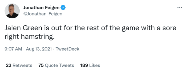 格林也在第二节受伤,他在一次跳投后感到不适,随后被换下场。火箭记者费根报道称,格林因右腿筋酸痛本场不会回归。退赛前,格林得到13分3篮板1助攻。他穿着训练服回到板凳席。