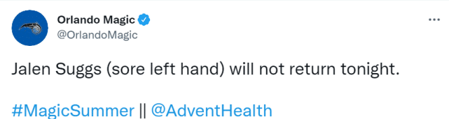 萨格斯在魔术对凯尔特人的比赛第二节受伤,当时他在一次上篮落地时伤到了左手腕,随后魔术官宣萨格斯退出今日比赛。退赛前,萨格斯得到6分2篮板2抢断。