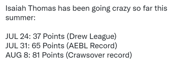 今年夏天,小托马斯参加了三项业余赛事。7月24日德鲁联赛轰下37分,7月31日AEBL联赛得到65分,创赛事得分纪录,8月8日Crawsover联赛得到81分,同样创赛事得分纪录!小托马斯的得分能力毋庸置疑,但他的身高劣势也摆在那儿,防守端容易被针对。