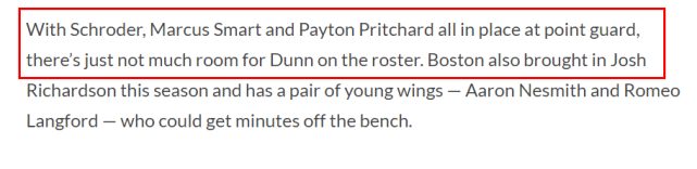 邓恩在一笔三方交易中来到凯尔特人,原本是为了增强绿军后场深度,但随着绿军得到施罗德,他们的施罗德、斯马特和普理查德都可以打控卫,邓恩的价值不大了。现在绿军的阵容里有16名球员在合同内,预计邓恩的500万合同可以用来换取未来的筹码或者增强侧翼的深度。