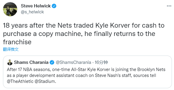 科沃尔是在03年被篮网选中,随后他被交易,有趣的是篮网用科沃尔换来现金,然后用这笔钱买了一台复印机,如今时隔18年,他又回到布鲁克林篮网队,名记Steve Helwick再次提到这件事。