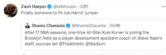 来源:JRS直播网08-13 15:34JRS直播网讯 北京时间8月13日,据名记Shams报道,NBA17年老兵凯尔-科沃尔加盟篮网,担任球员发展助理教练从而加入纳什的教练团;对此名记Zach Harper调侃终于有人来教乔-哈里斯跳投了。
