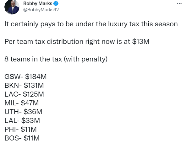截止到目前,联盟共有8支球队需要缴纳高昂的奢侈税,总额高达5.78亿美元;奢侈税缴纳情况是勇士1.84亿美元高居联盟第一,篮网1.31亿美元和快船1.25亿美元,分居第二和第三位,湖人需缴纳3300万美元排名联盟第六,几大夺冠热门都需要缴纳奢侈税。