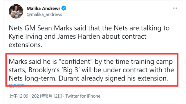 来源:JRS直播网08-12 15:55JRS直播网讯 北京时间8月12日,篮网总经理肖恩马克斯近日接受了采访,马克斯表示球队目前正在和欧文、哈登进行提前续约的合同谈判,而且自己有信心在新赛季训练营开始前,与三巨头完成长期合同的提前续约。