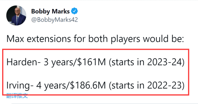 众所周知,此前篮网用4年1.98亿美元的肥约提前续约了球队领袖凯文杜兰特,新合同从22-23赛季开始施行。而现在,篮网又想提前续约另外两大巨头!据薪资专家鲍比马克斯报道,哈登最多可以提前续约3年1.61亿美元,新合同起始于23-24赛季。而欧文则最多可以签4年1.866亿美元,从22-23赛季开始。