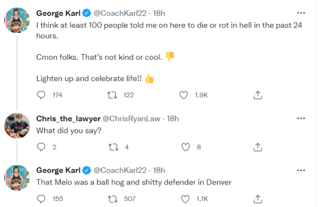 卡尔写道:“过去24小时,我认为至少100人在这里让我去死或者下地狱。拜托,这不友善也不酷,放松点吧……”有人追问卡尔:“你说了啥?”卡尔回复道:“掘金时期的Melo(安东尼)是一个球霸而且防守糟糕。”