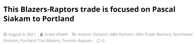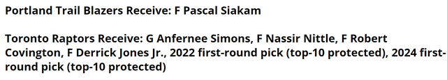 美国知名体育媒体建议开拓者打包送出安芬尼-西蒙斯、利特尔、科温顿、小琼斯、2022年首轮签(前十保护)和2024奶奶首轮签(前十保护),以此从猛龙换来西亚卡姆。