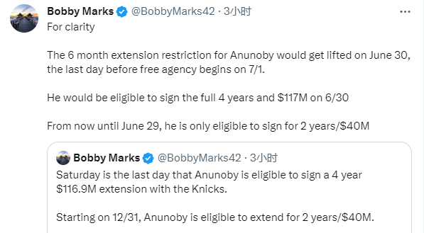 据薪资专家Bobby Marks报道,今天是阿努诺比有资格与尼克斯签下4年1.169亿美元续约合同的最后期限。他的合同目前还剩2年3850万美元(下赛季为1990万的球员选项)。