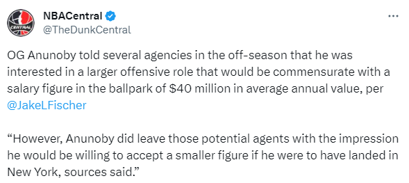 阿奴诺比曾在休赛期告诉几位经纪人,他想争取进攻端更大的角色,并拿到一份均薪每年4000 万美元的合同;不过阿努诺比确实给那些潜在的经纪人留下了这样的印象:如果他加盟纽约,他愿意接受一份薪资较低的合同。
