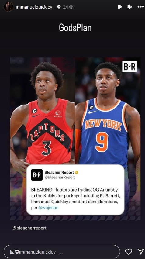 尼克斯交易奎克利是因为他们双方在续约年薪上存在700万美元的差距,在谈判陷入僵局后,奎克利的场均出场时间也从上赛季的28.9分钟下降至本赛季的24分钟;奎克利被交易后发推直言:我的天呐,还更新Ins转发交易报道并写道:天意。