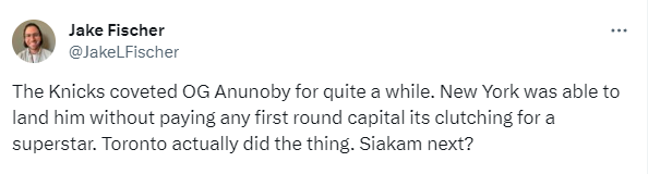 名记Jake Fischer跟进报道,猛龙在此时交易阿努诺比确实让联盟中的多支球队感到惊讶,阿努诺比被纽约视为布伦森、兰德尔身边的理想搭档。阿努诺比将以配角身份提高尼克斯的下限,尼克斯管理层会继续寻找和等待机会,等待一位超级球星进入市场并得到他,以提高球队的上限。