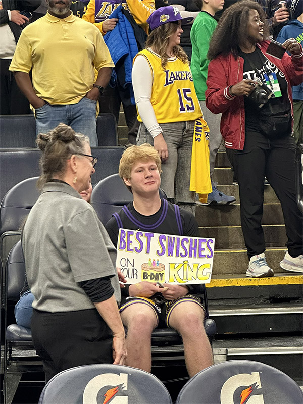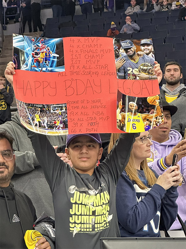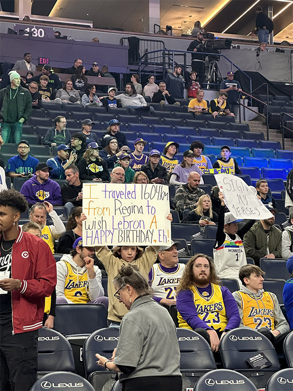 在森林狼的球馆内有一大批球迷高举标语祝贺詹姆斯生日快乐,并且直言想看詹姆斯打球,一球迷更是从1604公里远的地方赶来祝詹姆斯生日快乐。