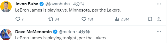 此前詹姆斯因左膝挫伤被列为出战成疑,对阵森林狼赛前,湖人官方更新伤情,詹姆斯因非新冠疾病出战成疑,老詹不仅有伤而且生病了;湖人主帅哈姆表示詹姆斯仍在接受球队医疗人员的评估,将在赛前决定是否出战,最终詹姆斯确定带病出战。