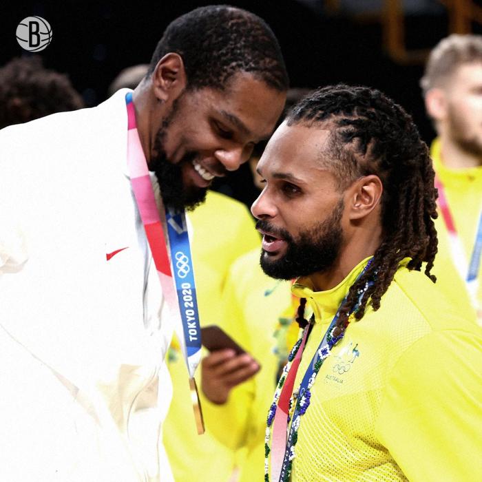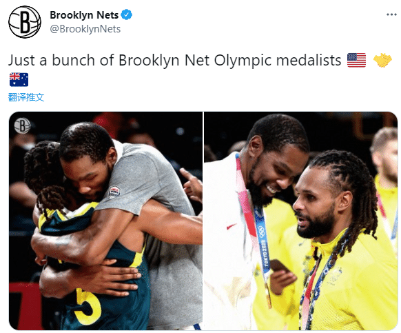 篮网官宣签约米尔斯之后,不仅晒出米尔斯昔日集锦,而且晒出杜兰特和米尔斯在东京奥运会的合影——一张是美国男篮半决赛淘汰澳大利亚,赛后杜兰特仅仅拥抱米尔斯;另一张是在颁奖仪式之后,杜兰特戴着金牌和戴着铜牌的米尔斯寒暄以及合影。