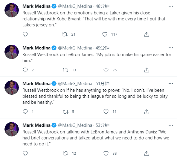 威少表示:我已经和詹姆斯\浓眉有了一些简短的谈话,我们讨论了新赛季我们需要做什么以及如何做到。詹姆斯是场上最好的球员之一,我来到一支总冠军级别的球队,我的任务就是帮助詹姆斯减轻场上的负担。