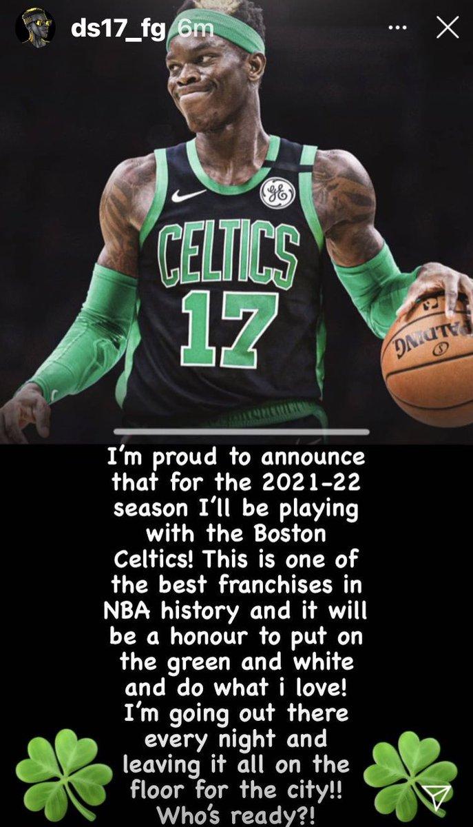 施罗德提前官宣,更新社交媒体:我很骄傲地宣布,2021-22赛季我将加入波士顿凯尔特人队,这是NBA历史上最好的球队之一,能身披绿军球衣去做我热爱的事情是我的荣幸,我将为了这座城市每晚在场上拼尽全力!你们准备好了吗?