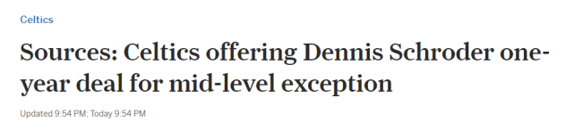 ESPN的Brian Winhost曾在3月份报道称,施罗德拒绝了湖人的一份4年8400万美元的报价,现在回头想想,施罗德或许会为自己的决定后悔。湖人的那份报价,平均年薪是2100万美元,而凯尔特人的全额中产只有950万,而且这还是凯尔特人很犹豫的价格,因为如果付出全部中产签施罗德,凯尔特人会陷入硬帽的境地。
