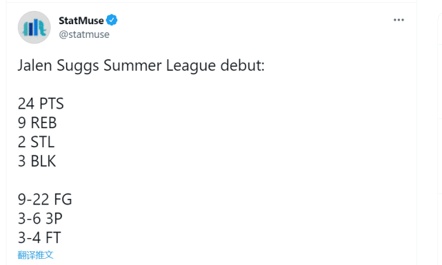 虽然只是一名新秀,而且只是夏季联赛首秀,但从今天这场比赛来看,萨格斯完全就是魔术队的领袖!进攻端突破和投篮兼备,防守端强度几乎拉满。全场萨格斯出手多达22次,而魔术其他球员最多只有9次,仅这一数据就可以看出萨格斯在队内的进攻地位极高。