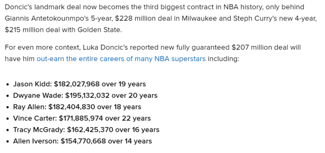 史上第三大合同!东契奇2.07亿有多猛?超基德19年生涯薪水总和