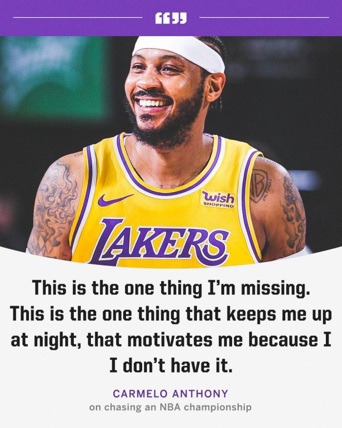 安东尼还谈到追逐总冠军,甜瓜表示:这(代指NBA总冠军)是我缺少的一样东西,这是让我夜不能寐的一件事,因为我没有它(总冠军),所以它一直激励着我。