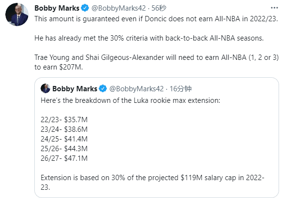 薪资专家Bobby Marks曝光东契奇新合同细节——22-23赛季年薪是3570万美元、23-24赛季33860万美元、24-25赛季4140万美元、25-26赛季4430万美元和26-27赛季4710万美元;东契奇还拥有最后一年球员选项。
