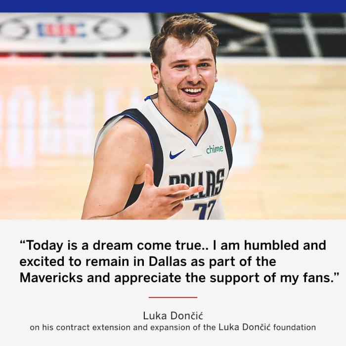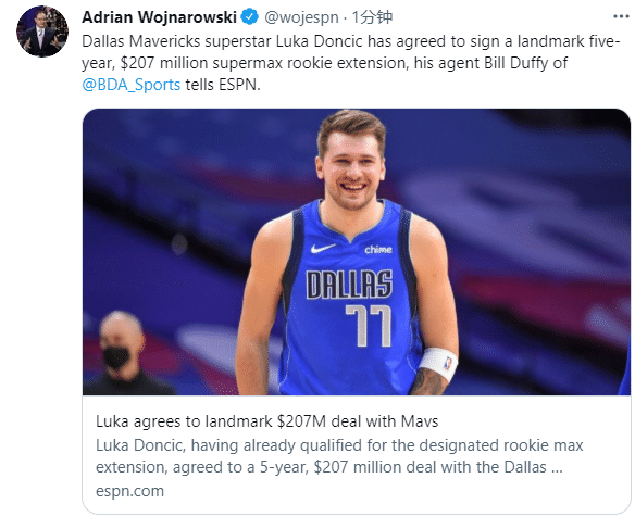 对于和独行侠续签5年2.07亿美元新合同,东契奇表示:今天是梦想成真的一天,篮球运动给了我很多,也带我去了很多令人惊叹的地方。作为独行侠队的一员留在达拉斯,我感到谦卑和兴奋,并感谢球迷的支持。