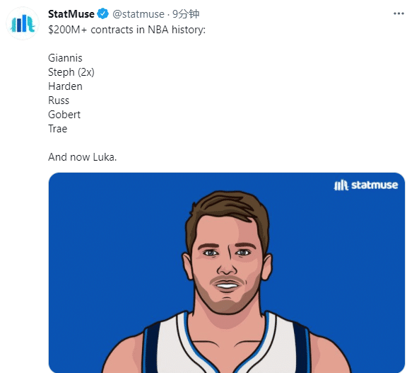 东契奇和独行侠提前续约5年2.07亿美元大合同,比肩字母哥、库里、哈登、威少、戈贝尔和特雷-杨成为NBA历史第7位签下2亿+大合同的球员,其中库里是史上首位签下两份2亿+合同的球员;此前特雷-杨也和老鹰续签5年2.07亿美元合同。