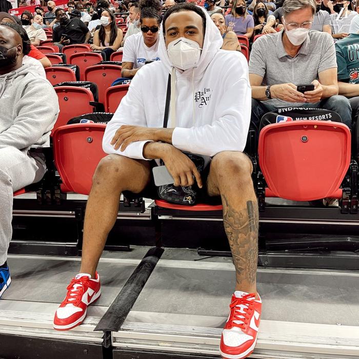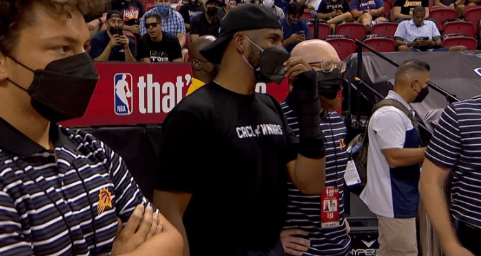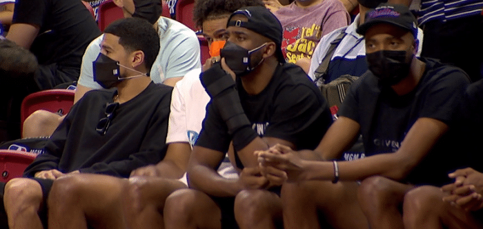 保罗身穿黑色短裤和T恤,反戴黑色棒球帽,赛前保罗拥抱小弟们,亲自来到现场观战,为小弟们加油打气;保罗坐在场边观战,布里奇斯和佩恩也来到现场,和保罗坐在一起。