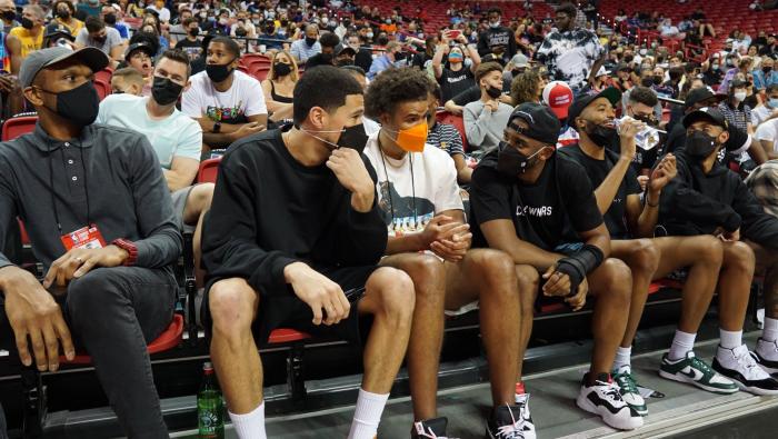 刚刚帮助美国男篮夺得东京奥运金牌的布克也来到现场,他和保罗等队友坐在一排,太阳主帅蒙蒂-威廉姆斯也来了;湖人队主教练沃格尔、助教菲尔-汉迪以及湖人新星霍顿-塔克也坐在场边观战,塔克和湖人续签3年3200万美元新合同。