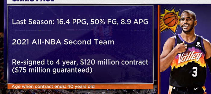 休赛期,保罗拒绝最后一年球员选项,之后和太阳续签4年1.2亿美元大合同,这是一份非完全保障合同,前两年完全保障,第三年部分保障和第四年无保障。