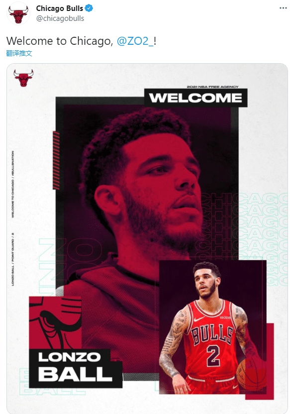 17年榜眼郎佐-鲍尔正式加盟公牛,新赛季改穿公牛2号球衣,联手拉文、德罗赞和武切维奇冲击季后赛;鲍尔拿到一份4年8500万美元大合同,最后一年拥有球员选项;鲍尔第一时间转发加盟公牛的官方推文。