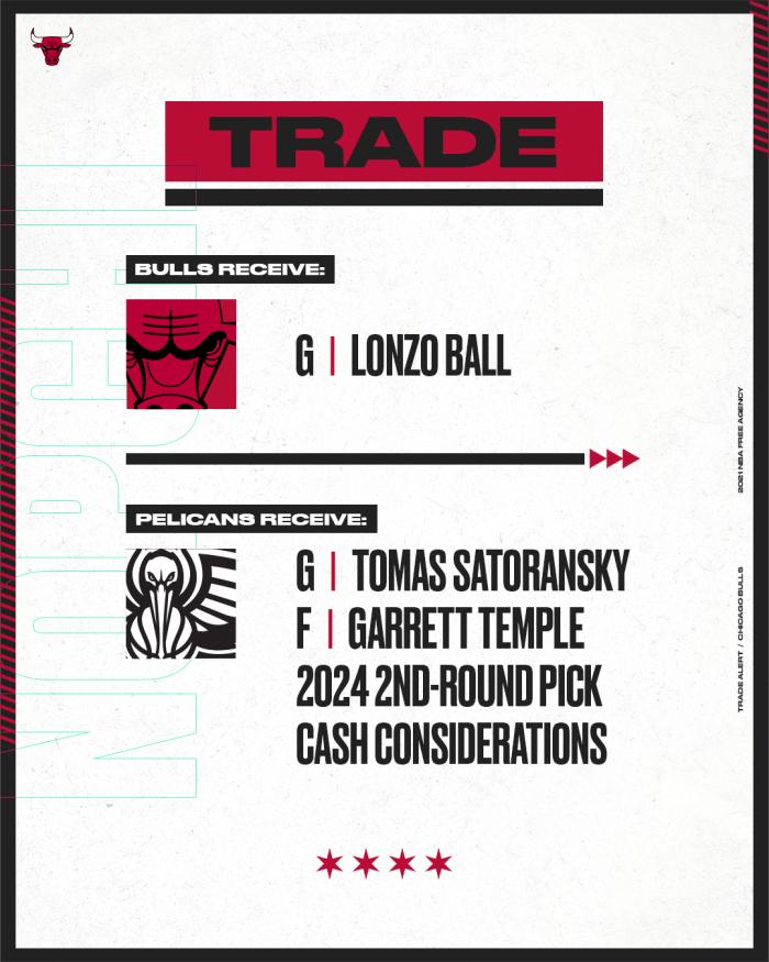 来源:JRS直播网08-09 15:27JRS直播网讯 北京时间8月9日,公牛和鹈鹕两队关于鲍尔的大交易正式达成,芝加哥公牛官宣,把萨托兰斯基、坦普尔、2024年次轮选秀权以及部分现金送到鹈鹕,从而正式引援郎佐-鲍尔;4换1大交易完成之后,公牛晒出鲍尔身穿公牛2号球衣照,发推:欢迎鲍尔来到芝加哥。