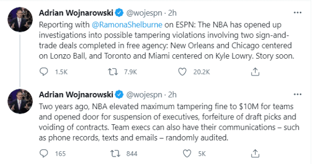 目前,球队的高管、球员的经纪人以及交易涉及的球员本人,都已经接到联盟的调查通知。NBA在2019年升级了对此类事件的惩罚力度,包括将罚款金额提升至最多1000万美元、停职球队高管,没收选秀权,甚至作废已经达成的合同。联盟调查的范围,可能包括涉事人员的通信记录,比如电话、短信和电邮等。