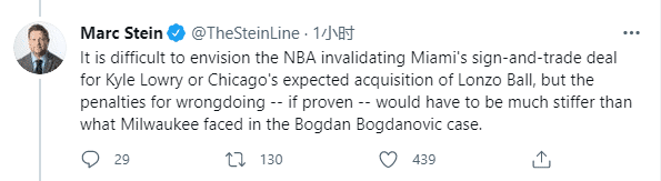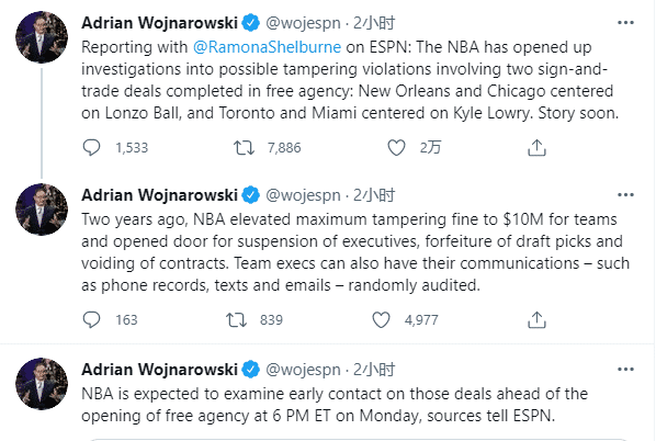 对于联盟调查洛瑞和鲍尔两笔交易是否违规,名记Marc Stein发推:很难想象NBA可能作废关于洛瑞和鲍尔先签后换的交易,但对违规操作的行为,一旦证实,他们将比雄鹿在博格达诺维奇案件中所面临的惩罚更加严厉。