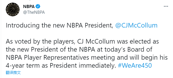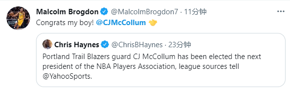自从2018年,麦科勒姆一直担任球员工会副主席,深入参与球员和联盟的谈判,如今他正式成为NBPA新主席,将负责领导工会与NBA进行集体谈判,他的任期将在2025年到期;布罗格登第一时间恭喜麦科勒姆当选球员工会新主席。