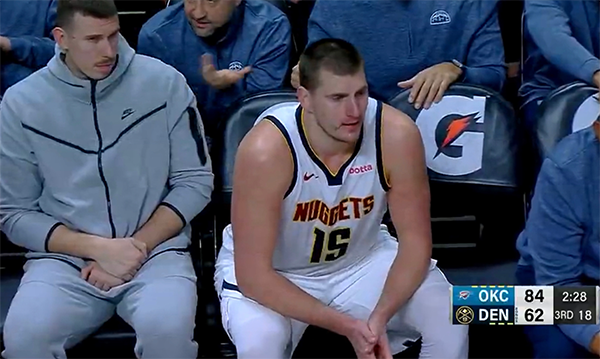 约基奇对于比赛非常不满,第三节分差被雷霆拉大,约基奇被换下,他在场下怒摔坐垫,表达不满的情绪。这场比赛约基奇个人的表现还是不错的,进攻效率也不低,但可惜还是无法阻挡对手的冲击。约基奇投篮10中9,得到19分10篮板7助攻的数据,还有7次失误。