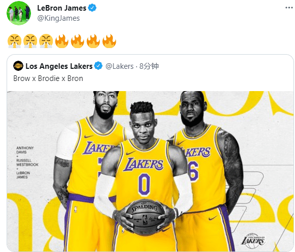 湖人官方晒三巨头合照!威少C位詹眉站两侧,詹皇转发并恭喜沃帅续约