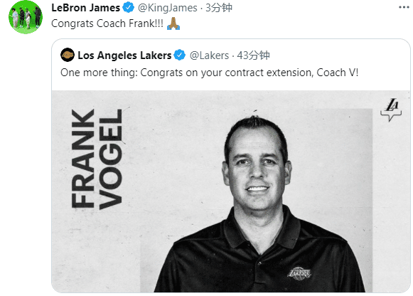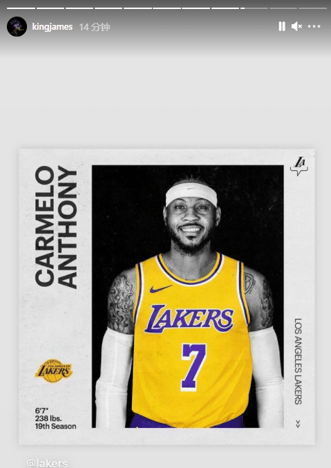 詹姆斯还发推恭喜沃格尔续约,并且连续更新多条Ins动态,欢迎安东尼、贝兹莫尔、纳恩等新援加盟湖人;新赛季,37岁的安东尼将会身穿湖人7号球衣,生涯首次联手詹姆斯,昔日绝代双骄并肩作战,这代表了无数人的青春。