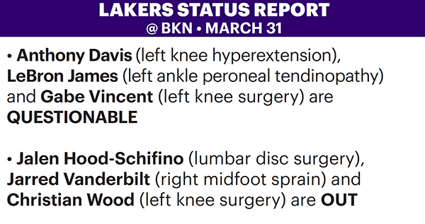 安东尼-戴维斯(左膝过度伸展)、勒布朗-詹姆斯(左脚踝腓侧肌腱炎)、盖布-文森特(左膝手术)出战成疑;杰伦-胡德-希菲诺(腰椎间盘手术)、贾里德-范德比尔特(右中足扭伤)、克里斯蒂安-伍德(左膝手术)都因伤继续缺席比赛。