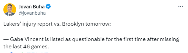 重磅!文森特回归倒计时,湖人冲击总冠军再添砝码!