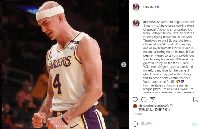 卡鲁索和公牛完成签约后,将自己的社媒头像改成了身穿3号公牛球衣的图片。他晒出多张自己效力湖人时的照片,发文回顾自己的湖人生涯,对湖人表达了谢意。