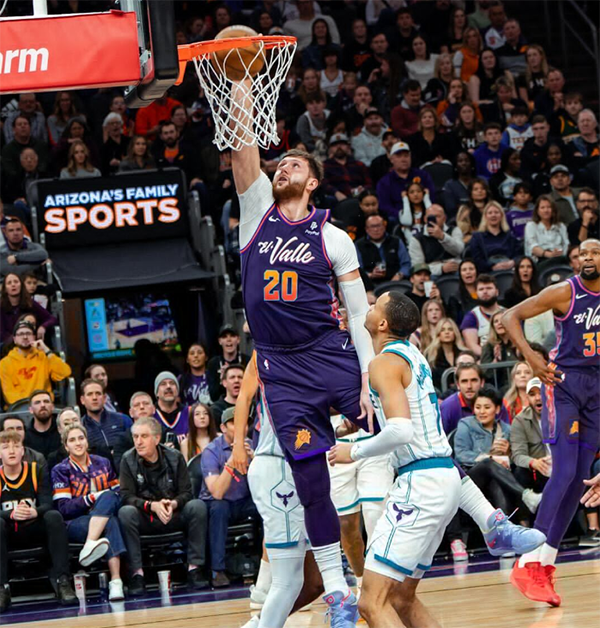 末节杜兰特招牌中投,外线轰进三分回应华盛顿,之后太阳进攻停滞,黄蜂一波8-2追到10分,暂停回来,杜兰特空位三分一击即中,持球背打金鸡独立再拿2分;黄蜂继续追分,布克两罚全中,杜兰特助攻弩机,太阳牢牢保持领先,杜兰特大帽布里奇斯并且助攻戈登再中三分,黄蜂5-0打停太阳,最后3分多钟比尔重新上场,布克连续造杀伤罚球得分,布克突破上篮,罗齐尔再中三分,最终太阳凭借高效的进攻击败黄蜂,杜布坐在替补席咧嘴笑,开怀畅聊。