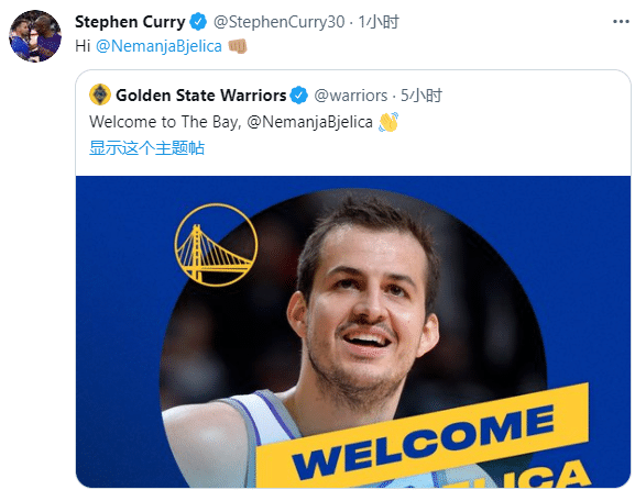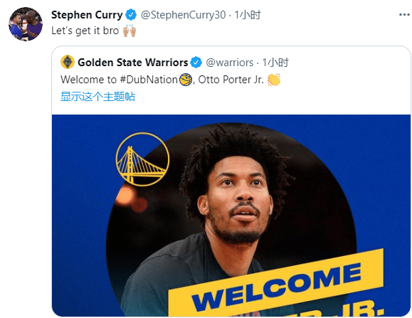 勇士还正式官宣签约奥托-波特和别利察,勇士两大新援都是签约老将底薪合同,库里第一时间欢迎新队友,欢迎别利察和奥托-波特加盟勇士,库里还晒出视频集锦,欢迎伊戈达拉重返勇士。