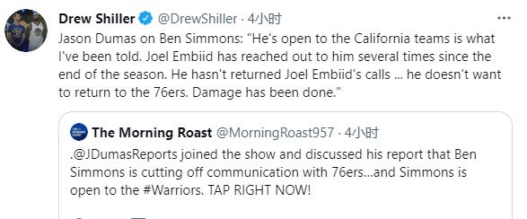 另外就是在76人这边,他们签下了德拉蒙德,续约了丹尼格林,但更关键的还是本西蒙斯的交易!据《露天看台》记者Jason Dumas报道,本-西蒙斯已经不和76人方面的人联系;他和76人之间的一切联系通过他的经纪人里奇-保罗。Dumas说:“他不想回76人了,他们之间的关系已经破裂了。”
