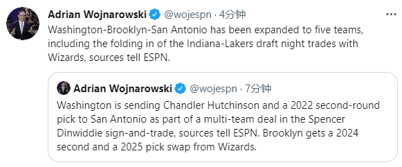 作为交易的一部分,奇才还把哈奇森和一个次轮签送到马刺,之后名记报道该笔交易还涉及到湖人和步行者,五队多人大交易,其他交易细节有待更新。