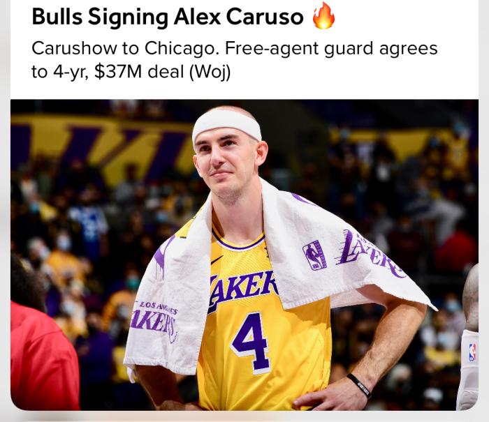 卡鲁索经纪人透露,自由球员卡鲁索和公牛达成了一份四年价值3700万美元的合同。上赛季,卡鲁索为湖人出战58场,场均可以贡献6.4分2.9板2.8助。这样的合同湖人是给不起的,虽然球迷和老詹都很喜欢他,过去这几年他稳定地在替补席提供防守和得分,作为落选秀也是一个励志典范!