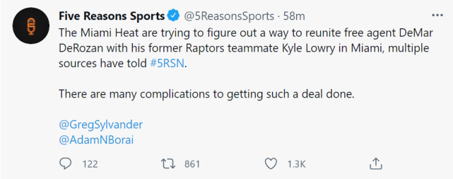 来源:JRS直播网08-02 10:25JRS直播网讯 北京时间8月2日,据美媒Five Reasons Sports报道,多个消息源透露,热火正在尝试寻找同时得到洛瑞和德罗赞的方法,两位球星在今年夏天都将成为完全自由球员,他俩曾在猛龙共事6年。名记马克-斯坦恩也确认了这一消息。Five Reasons Sports还指出,要完成这个目标相当复杂。